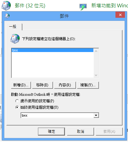 狀況:每次開啟outlook 2010 都卡在"選擇設定檔"的畫面設定方式:1. 打開控制台 2. 改成圖示顯示,找到 “郵件(32位元)”3. 打開後按 “顯示設定檔” 4. 點選為 "@始終使用這個設定檔" 然後按確定離開。 2014/04/17
